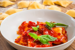 Ravioli adalah jenis pasta yang terdiri dari isian yang di selimuti adonan pasta tipis. Di sajikan dalam kaldu atau dengan saus,mereka berasal sebagai makanan tradisional dalam masakan italia.