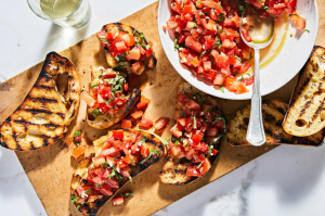 Bruschetta adalah makanan pembuka italia yang terdiri dari panggang yang di beri bawang putih,minyak zaitun,dan garam.