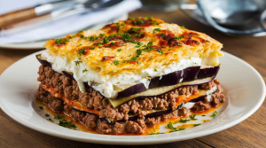 Moussaka merupakan sebuah makanan yang berasal dari yunani dan turki. Bahan utama moussaka berupa terong dan tomat. Di tambahkan pula daging cincang dan keju per paduan lembutnya tekstur dan rasa khas dari terong bersama daging,begitu menggugah selera dengan rasa cenderung oriental khas lidah indonesia.