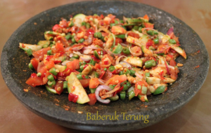 Beberuk terong adalah makanan khas lombok yang di buat dari lalapan terong dan kacang panjang dengan sambal tomat yang pedas. Bahan untuk membuatnya antara lain terong,bawang merah,tomat,cabe rawit,garam,gula pasir,minyak,dan air.